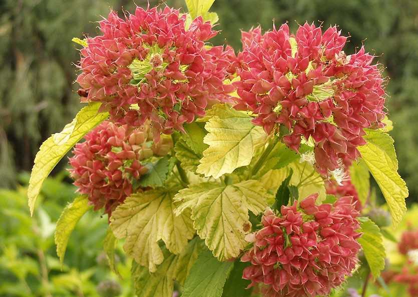 Пузыреплодник ‘Ред Барон’ радует розовыми цветами в момент цветения и красными ягодами в период их созревания. Вырастает до 2 м в высоту. Пузыреплодник калинолистный ‘Red Baron’ К наиболее распространенным желтолистным сортам относятся следующие: