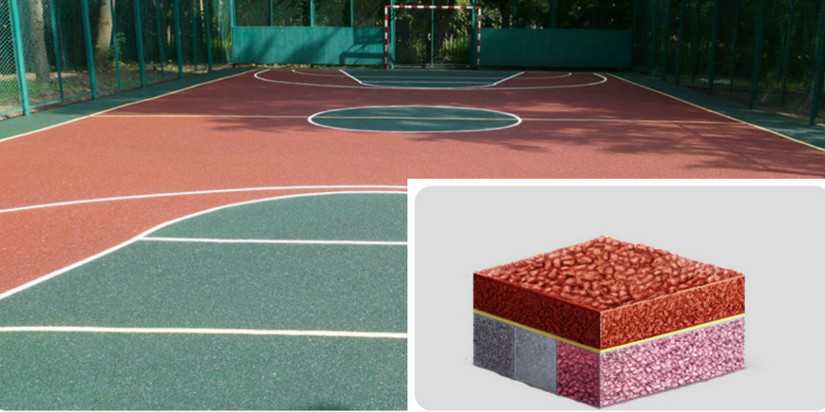 При укладке в покрытия два слоя нет необходимости в нижний добавлять пигмент для резиновой крошки, поэтому смесь для него изготавливают без краски. Для увеличения упругости покрытия может применяться резиновая крошка более мелкой фракции (0,5-2,5 мм). Это повышает удельный вес (снижает пористость) и делает нижний слой более жестким.