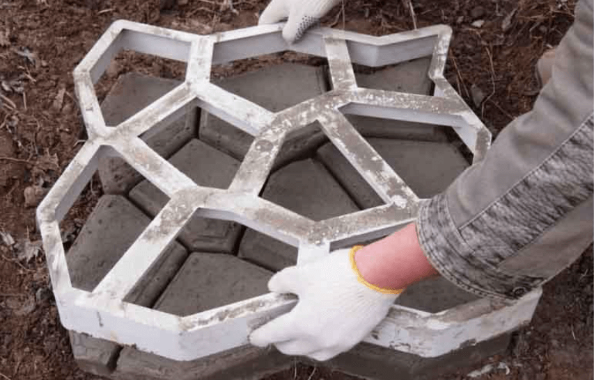 - Цементная смесь «схватится» через полчаса, тогда формочки можно снять, перекладывая их дальше по будущей дорожке и повторяя процесс. С полусырого раствора снимаются смазанные маслом формочки без особых усилий;