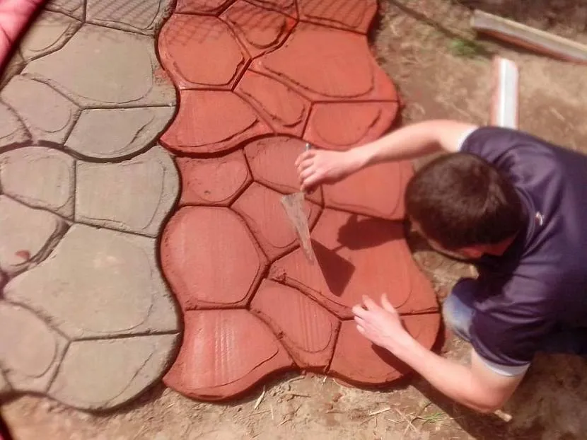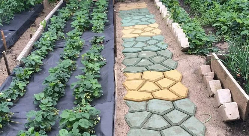 Разновидности дорожки садовой бывают разными. Если собрать формы для заливки, то получают облицовку авторского дизайна. В смесь бетона добавляют красители, мраморную крошку или гальку, а на поверхности деталей оставляют отпечатки. Для создания тропки из трафаретов не требуются строительные навыки.