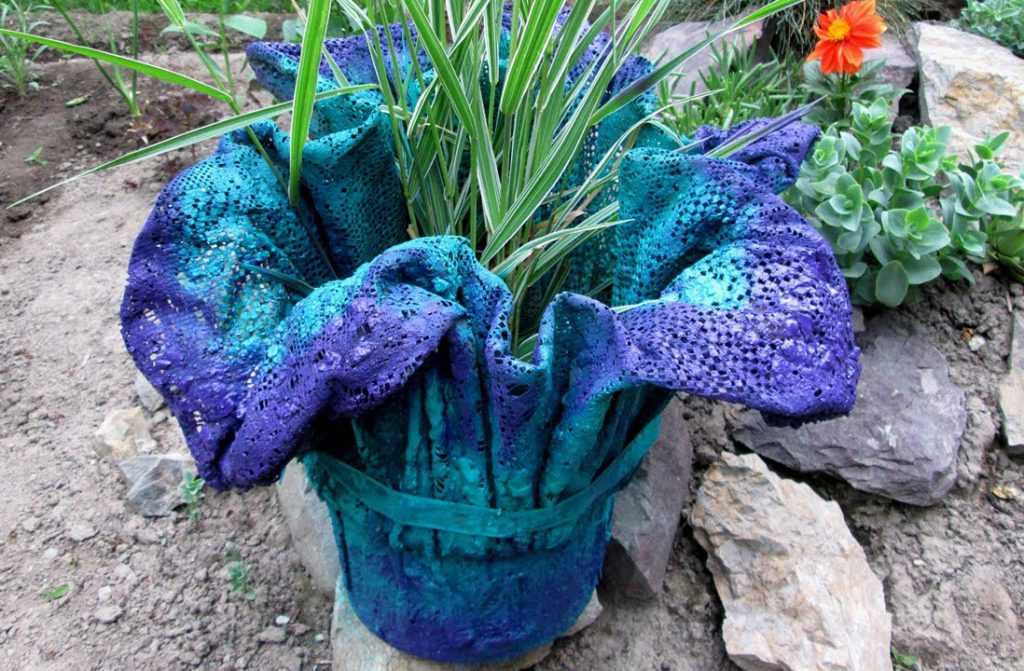 - Заготовку. В большинстве случаев применяется мешковина или тюль. Следует отдавать предпочтение рельефным тканям — это позволит получить на стенках горшка красивый узор.