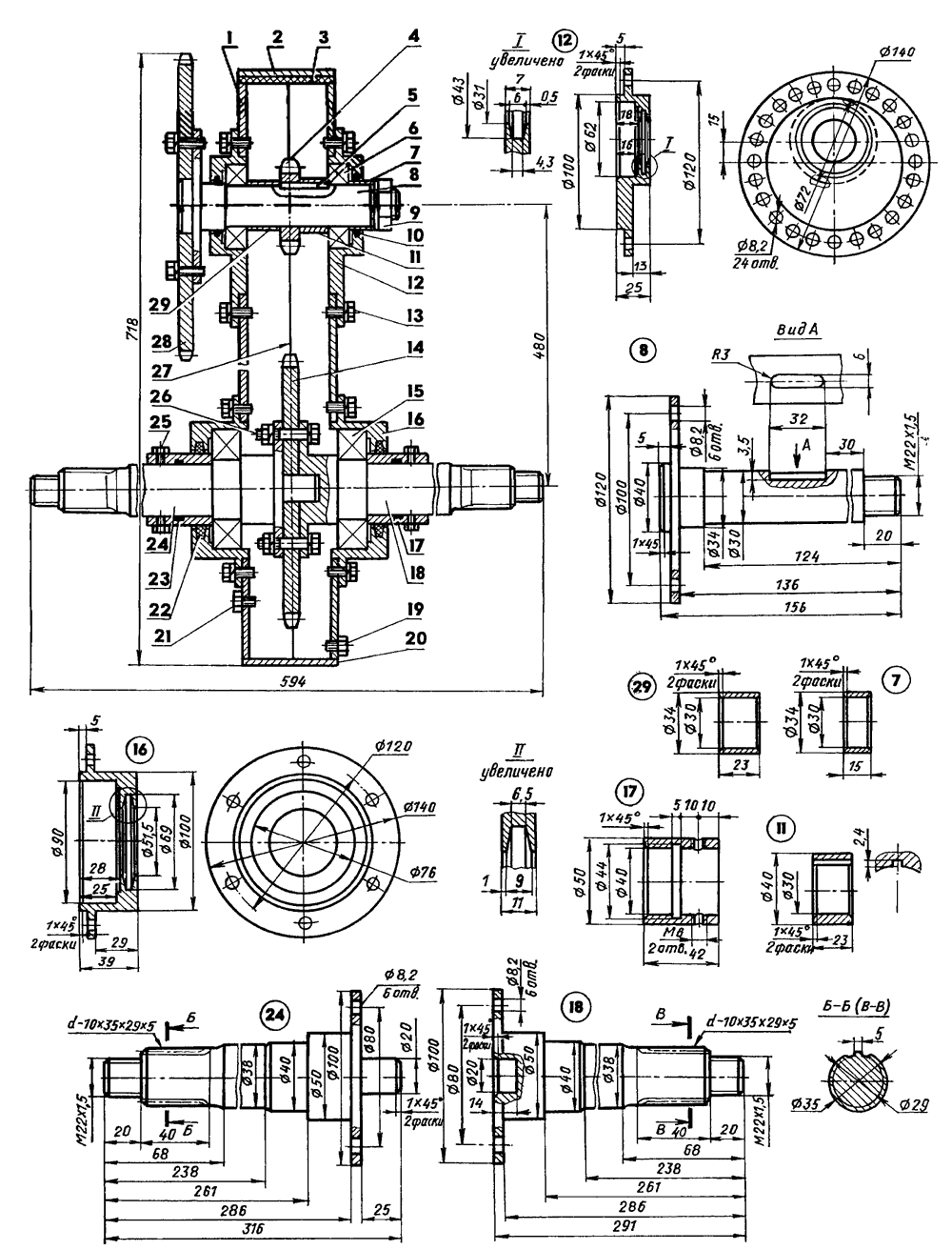 1 — корпус (швеллер № 20); 2 — крышка (СтЗ, лист s5); 3 — прокладка (маслостойкая резина) 4 — ведущая звездочка второй ступени (z = 11, t= 19,05); 5—шпонка; 6 — подшипник 206 (2 шт.); 7— компенсационная втулка; 8 — вал; 9 — гайка М22х1,5 с пружинной шайбой; 10 — сальник; 11 —дистанционная втулка со шпоночным пазом; 12—эксцентриковый корпус подшипника (СтЗ, 2 шт.); 13 — винт М8 с пружинной шайбой (30 шт.); 14 — ведомая звездочка второй ступени (z = 25, t = 19,05); 15— подшипник 3008 (2 шт.); 16 — корпус подшипника; 17 — уплотняющая втулка; 18 — левая полуось; 19—пробка сливного отверстия масла (винт М10); 20 — дно корпуса (СтЗ, лист s4); 21 — пробка заливного отверстия масла (винт Ml0); 22,23 — сальники (по 2 шт.); 24 — правая полуось; 25 — фиксирующие винты М6 (8 шт.); 26 — болт М8; 27 — цепь t = 19,05; 28 — ведомая звездочка первой ступени (z = 57, t = 12,7); 29 — дистанционная втулка