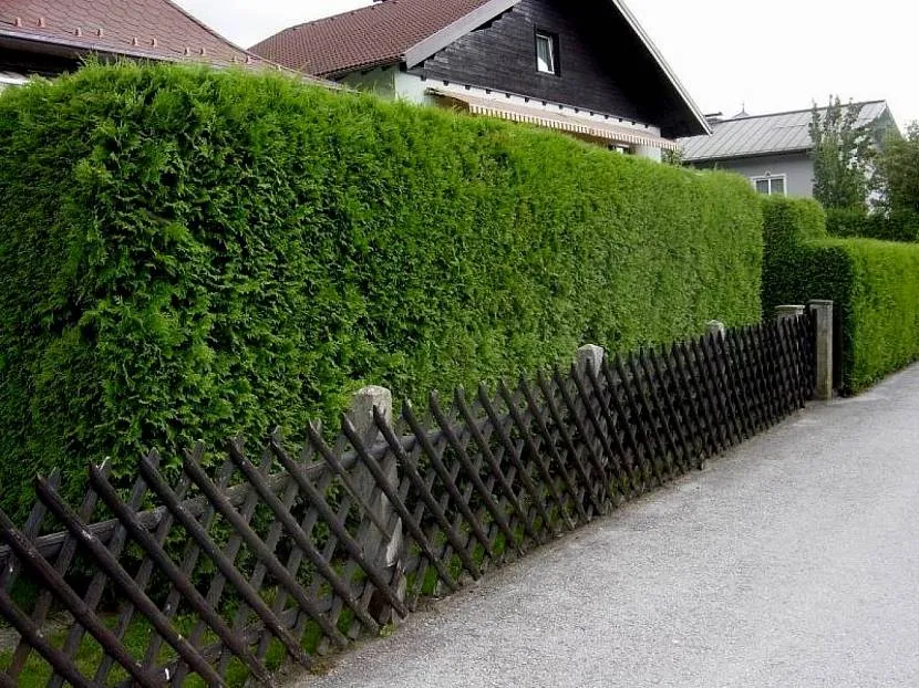 Насчитывают несколько десятков различных сортов туи. Разновидности этого вечнозеленого растения отличаются цветом хвои, высотой и формой кроны. В связи с этим, возникает вопрос: какую тую лучше выбрать для живой изгороди? Для оформления границ приусадебного участка используют средние и высокорослые деревца, а для зонирования территории внутри него высаживают низкорослые сорта. Выбор того или иного сорта зависит от представлений внешнего вида будущего плетня. И уже, отталкиваясь от них, высаживают различные сорта: пирамидальные, плакучие, шаровидные или нитевидные.