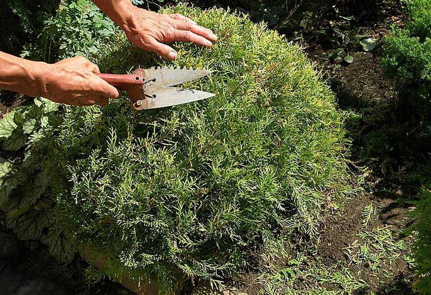 Приступают к формированию кроны, когда растения уже выросли до нужного вам размера. Иногда достаточно одной стрижки в год – весенней, но обычно возникает необходимость повторной обрезки – в конце лета или начале осени. Некоторые формы нуждаются в постоянной корректировке кроны, однако за один раз можно срезать не более одной трети побега, иначе растение может ослабеть. Первая обрезка туи проводится не раньше, чем на 2-3 году жизни. Используйте для стрижки остро наточенный мощный секатор, чтобы он не зажевывал побеги и не оставлял на них вмятин.