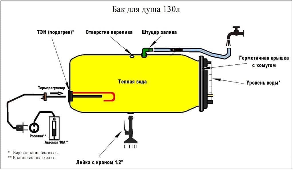 Простой душ на даче своими руками с подогревом делают с баком, выкрашенным темной краской. Размещая сооружение на освещенном месте, за сутки получают большую бочку горячей воды.
