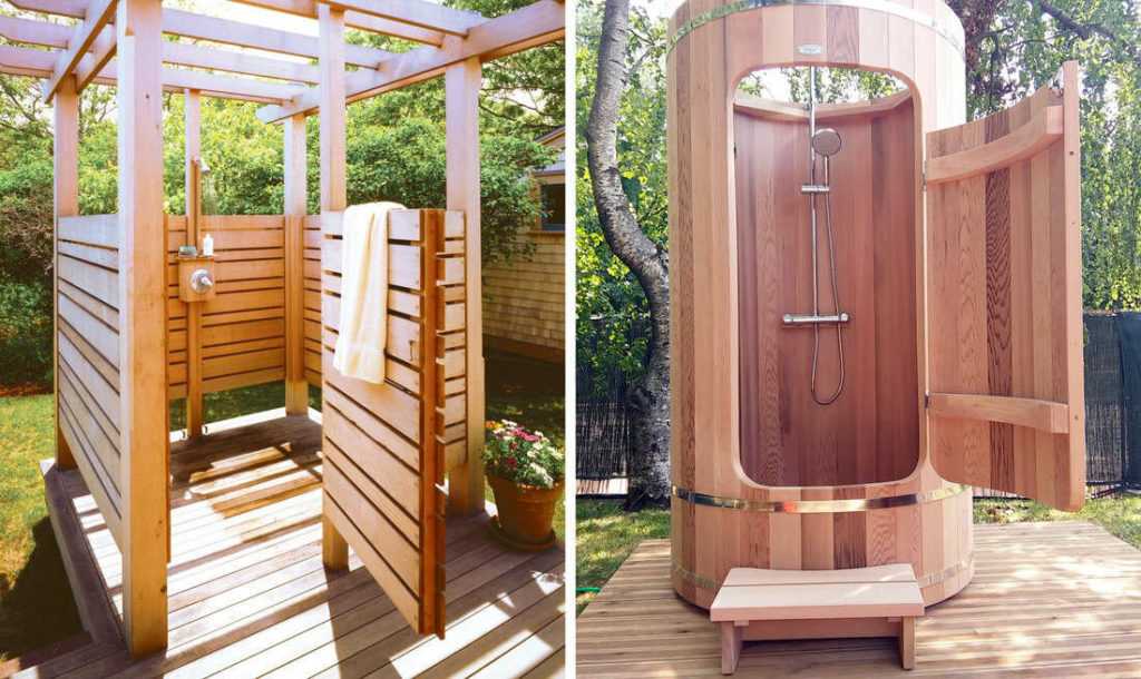 Стандартных размеров для душа нет, их каждый строитель определяет произвольно. Сооружение может быть очень компактным — просто небольшая кабинка со шторкой — или более просторным, с раздевалкой, помещением под обогреватель, местом для умывальника, зеркала, сушки полотенец. Интересны варианты, когда летний душ интегрирован в спа-зону с открытым бассейном, площадкой для принятия солнечных процедур и отдыха.