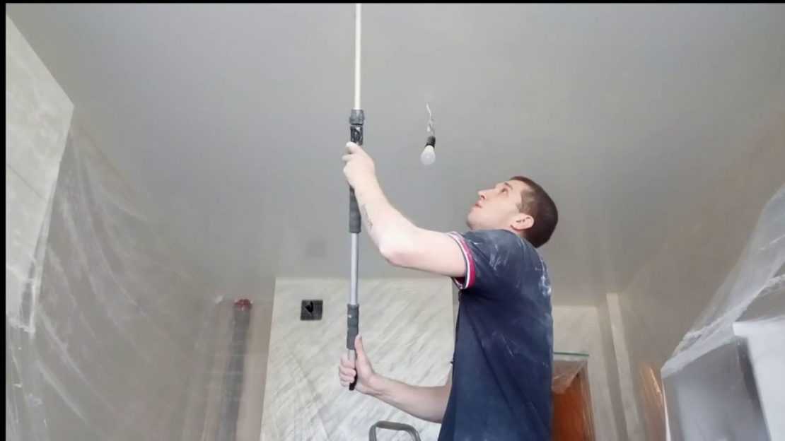 Совет: Потолок из гипсокартона следует красить валиком только с коротким ворсом, это позволит получить по окончании работ гладкое и качественное покрытие. Не стоит использовать для покраски потолка валик из поролона — он оставляет следы. Валик для потолка нужно брать с длинной рукоятью, как показан на фото.