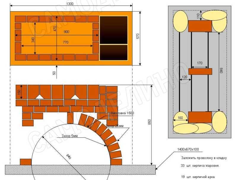Приведенные чертежи демонстрируют, что мангал размещается на фундаменте, свод арки опирается на каркас из арматуры, задняя стенка выполнена также из кирпича. Для подачи воздуха в область горения предусмотрены 4 треугольных отверстия в жаровне.