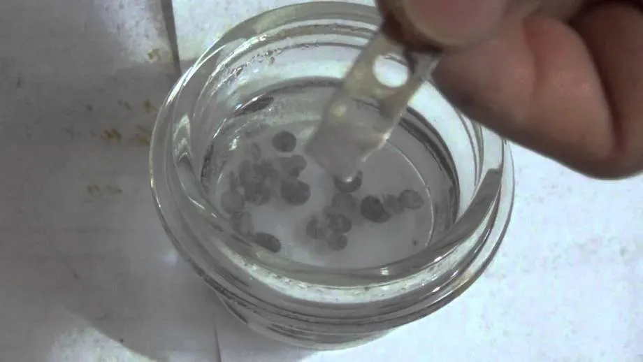 Первым делом подготавливается лабораторная емкость, в роли которой выступает стеклянная баночка, или другая фарфоровая и керамическая емкость. В нее следует поместить цинк или остатки от батареек. Только после помещения добавок в емкость помещается концентрат соляной кислоты