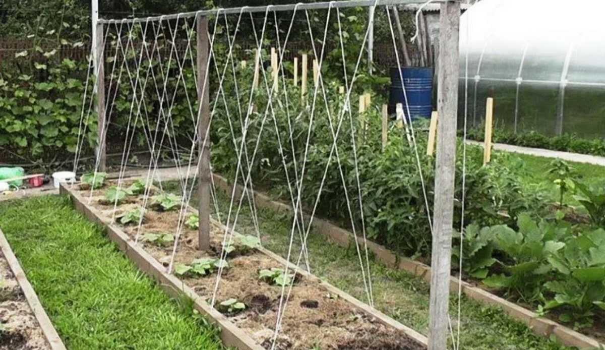 Между ними привязывают сетку или веревки. Их привязывают возле земли к нижним кольям, тянут вверх, а потом перекидывают через поперечину и фиксируют с другой стороны грядки внизу.