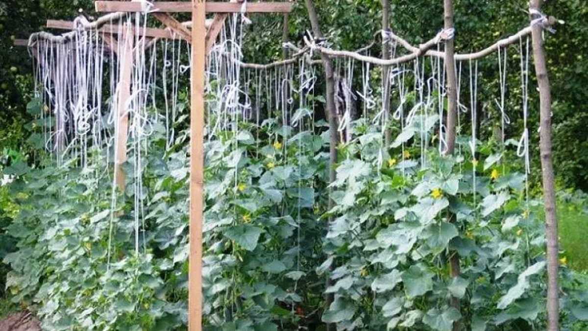 Столбы нужно соединить перекладиной в верхних частях. На каждую из них с двух сторон забиваются гвозди через каждые 25 см. К ним привязывается проволока или веревка, которая свисает вниз до уровня почвы. На краях делают петли, чтобы потом накинуть их на растения. По мере роста плети сами зацепятся за проволоку усами. Веревку нельзя натягивать сильно, так как огурцы могут вырвать сами себя из почвы.