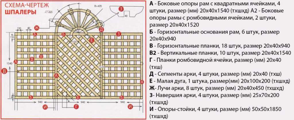 Конструкцию опоры делают в зависимости от собственного пожелания, что должно соответствовать месту и потребностям растения, для которого делают шпалеру. Самые распространённые формы это: